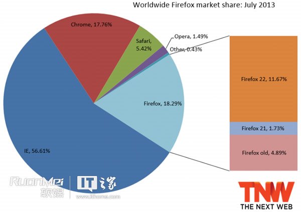 Firefox在7月份的表现很差,份额大幅降至18.29%;上一次看到Firefox的份额接近18%还是2008年5份的事情。Firefox22在发布后的第一个满月份额达到了10.21%。