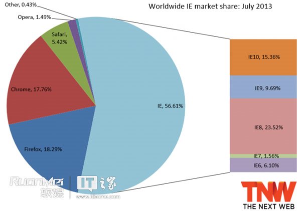 2013年7月的浏览器市场份额报告出炉,统计数字来源于 Net Application,谷歌Chrome成为上个月最大的赢家。 从6月份到7月份,IE收获了0.46%的份额(56.15%增至56.61%)、Firefox丢失0.86%的份额(19.15%大幅降至18.29%),Chrome上扬0.59%(17.17增至17.76%)。 以56.61%的市场份额,IE增长到了今年的新高。IE10在7月收获1.84%,份额增长到15.36%;IE9下滑2.02%至9.69%。IE8依旧是世界上最受欢迎的浏览器,7月市场份额是23.52%。