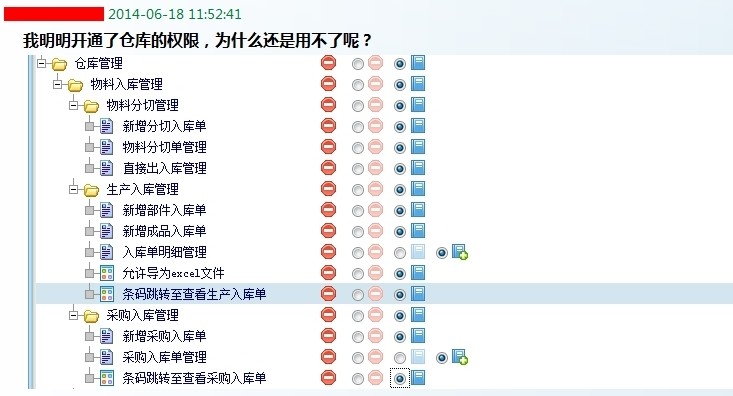 ![]() 不少ERP用户认为只是开启上图所示功能权限即可,其实不然。还需开启资源权限。