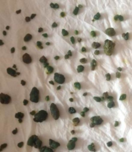 上图是第一次排除的结石,看起来挺像翡翠的,它可是毒素哦!