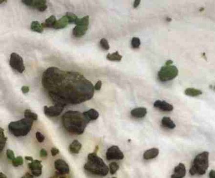 第二次肝脏清洗出来的结石,有一些是黑色的,说明它的年数已久。越老的结石颜色越深,越年轻的结石颜色越绿。
