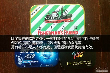 除了提神的饮料之外,一些刺激性的食品也是可以准备的,例如超凉爽的薄荷糖,很辣或者很酸的食品等。薄荷糖我不知道是不是大家都有效果,但是超辣或超酸的食品绝对有效果。