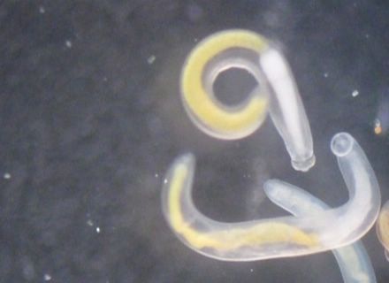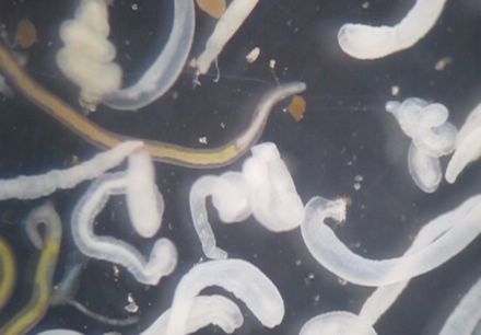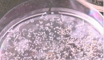 那这杯粉红色液体里到底有没有寄生虫呢? 实验君把它放在解剖镜下观察。我勒个苍天!一大片蠕动的虫子!透明的表皮,黄色和白色的身体,有的展开身子像蚯蚓一样游动,有的盘起来像螺蛳一样!可以想象这些家伙在我们的胃里会是什么样!