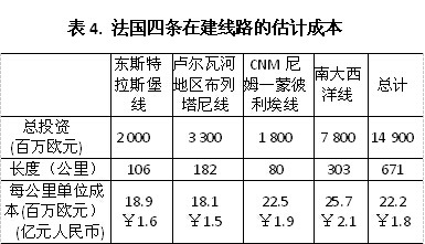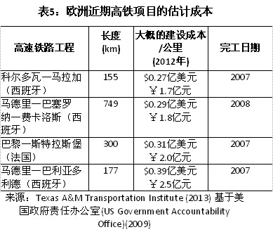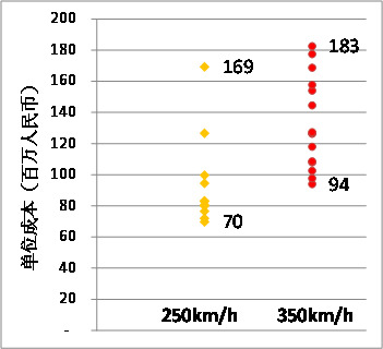 中国历年高铁里程 对2013年末27条运行中高铁建设成本的分析显示,各条线路的单位成本差异很大。设计时速350 公里的线路单位成本为每公里9400万至1.83亿元。设计时速250 公里的客运专线(个别除外)的单位成本为每公里7000万至1.69亿元。加权平均单位成本(包括工程筹备、土地、土建工程、轨道工程、车站工程[但只含部分大车站],四电工程,机车车辆,维修场站,以及建设期利息等成本):时速350 公里的项目为1.29亿元/公里;时速250 公里 的项目为0.87亿元/公里。 相比之下,欧洲高铁(设计时速300公里及以上)的建设成本高达每公里1.5-2.4亿元人民币。加利福尼亚州高铁建设成本(不包括土地、机车车辆和建设期利息)甚至高达每公里5200万美元,约合3.2亿元人民币。
