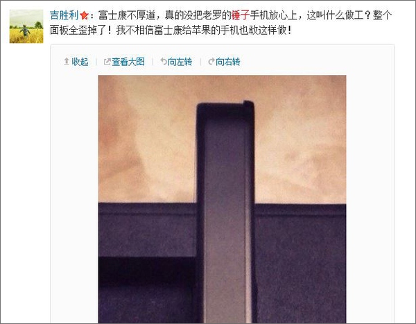 7月8日,罗永浩的锤子手机开始发货,声称首批日发货量在几百台到一千台之间。但据网友根据客户晒出的发票编号推算,真实的日发货量应该不到300台。为什么首批发货量这么少?罗永浩解释说是因为品控标准非常严格,声称:“其实,现在我们产线上不能通过质检的大多数产品,做工也要比绝大多数手机厂商的产品好很多。目前为止,我们送测的工程机在做工方面几乎得到了所有媒体的一致好评,但和工程机一样水准的做工,在我们的产线上仍然是不良品。”“我们只要放松一点点品控标准,就会带来产能上的明显提升,但相信这不是你们希望的结果……”“我们的硬件工程师核心团队已经全部驻厂一两个月了,我们将竭尽全力,在不放松品控标准的前提下尽快为大家发货……” 那么在如此严格的品控标准下放出来的机器做工是什么样的呢?收到首批锤子手机的客户,纷纷在网上晒出收到的真机,投诉发现的种种问题,归纳如下: 一、多人投诉锤子手机做工粗糙,材质低廉,边框缺损,“有碎玻璃的扎手感觉。仔细一看是屏幕边框脆裂了,大大小小的有几处,最严重的一处已经使得手机漏光了。又用指甲在屏幕边框其他几个完整的位置稍用力划了几下,也留下了可见的划痕,还刺手。”“我用指甲稍用力又划了一道,依然是一条可见还刺手的道子。”