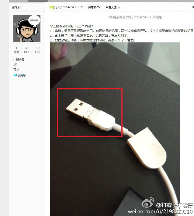十三、有人在地铁站试用抢拍功能时,手机滑落。想当初罗永浩吹嘘锤子手机的抢拍功能时,大家都说会摔的,果不其然。 十四、配件质量也差。数据线插口很紧,拔数据线时脱胶。