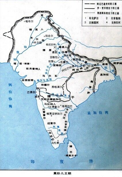 笈多王朝的领土范围 旃陀罗笈多二世取得了一次对塞人的辉煌胜利,常常被认为是印度传说中的伟大英雄超日王。中国僧人法显在旃陀罗笈多二世在位时访问了印度,他描写这位国王的贤明统治使印度人民安居乐业。笈多王朝的文化非常繁荣。婆罗门教再度兴起,不过此时它已经开始向现代印度教转变;佛教和耆那教继续拥有广泛信徒。笈多君主的宗教政策总体上来说是容许所有教派传播。在文学上,出现了古代印度最伟大的诗人迦梨陀娑。 7,后笈多王朝(公元700年前后) 从中亚侵入印度的嚈哒人(白匈奴)严重地损害了笈多王朝。嚈哒人后来被印度社会所同化,但他们在5~6世纪的活动促成了帝国的解体。许多地方王公和民族反对笈多王朝的中央权力,于是这个帝国迅速瓦解了。所谓后笈多王朝(实际上与真正的笈多王室没有关系)的统治权力再次退回摩揭陀。7世纪的印度是分裂和混乱的,除了卡瑙季(曲女城)的统治者戒日王在北印度建立过短暂的霸权之外,没有一个王公拥有广大的权力。不过,在南印度则兴起了几个强盛的政权,如遮娄其人(其统治者打败了戒日王的进攻)、罗湿陀罗拘陀王朝和帕拉瓦人。 8,拉其普特(7世纪中叶直到12世纪末) 大约在7世纪北印度兴起了一种新的力量,即拉其普特人。他们在7~8世纪之后的印度历史中起了突出作用。从7世纪中叶直到12世纪末穆斯林征服北印度之间的历史时期常常被称为拉其普特时期。在这段时间里,几乎所有的北印度政权都是拉其普特人建立的;南方的遮娄其人也是拉其普特人的一支。拉其普特人并不是一个统一的民族,他们中特别重要的有瞿折罗-布罗蒂诃罗人、兆汉人和遮娄其人。各拉其普特王国之间混战不已,同时又激烈抵抗伊斯兰教力量对印度的侵略,以致拉其普特人常被认为是印度教的保卫者。阿拉伯人在8世纪初征服了印度西北部的信德,揭开了穆斯林入侵印度的序幕。 9~11世纪在南印度出现了几个强大的王国,如朱罗国(注辇)和潘地亚。其中朱罗国曾经侵入印度尼西亚诸岛屿。 9,伊斯兰 A.德里苏丹国 伊斯兰对印度的真正征服开始于11世纪,是由中亚的突厥人进行的。伽色尼王朝的苏丹马茂德入侵印度12次以上,在北印度造成严重破坏。伽色尼王朝在中亚的领土于1173年被其位于阿富汗的原附庸廓尔王朝吞并。廓尔王朝的统治者穆伊兹-乌德-丁·穆罕默德(廓尔的穆罕默德)在1192年的第二次德赖战役中决定性地击败了兆汉人;他留在印度的总督(出身奴隶)顾特卜-乌德-丁·艾伯克于1206年采用苏丹头衔统治被穆斯林征服的北印度地区,定都德里。此后直到莫卧儿帝国建立,北印度的历史即为德里苏丹国的历史。 德里苏丹国是由来自阿富汗的突厥人建立的穆斯林政权。先后有5个王朝在德里进行过统治:奴隶王朝,卡尔吉王朝,图格鲁克王朝,赛义德王朝和罗第王朝。不过,德里苏丹国并非统一了整个印度的帝国。除了在阿拉-乌德-丁·卡尔吉等极强大的苏丹统治时期,德里苏丹国充其量只是北印度的一个最大的王国。北印度的拉其普特人继续保有强大的力量,而南印度则几乎从未进入苏丹政权的版图。阿拉-乌德-丁·卡尔吉时期对德干地区的3次大举入侵使德干北部服从苏丹统治直到14世纪;菲罗兹·图格鲁克苏丹臣服了印度教王公统治的奥里萨。困扰苏丹的问题主要是叛乱和外部入侵。 在整个德里苏丹国存在时期,叛乱和王室内讧层出不穷。各地的分立势头从未被有效遏止,几个著名的苏丹都曾镇压过大规模的叛乱。外部入侵的威胁开始主要是来自蒙古人,后来则是中亚的征服者帖木儿。帖木儿的可怕入侵终于使摇摇欲坠的苏丹政权彻底崩溃。德里苏丹国在帖木儿撤离之后不久解体,独立王国林立各地,虽然还有名义上的苏丹,但他们的权力几乎只限于德里和旁遮普。 德里苏丹国时期,印度的穆斯林文化有了很大发展。许多苏丹执行相对宽松的宗教政策,除了征收人头税之外并不对非穆斯林居民进行迫害。伊斯兰式的宏伟建筑在印度耸立起来,这一时期所形成的建筑风格有时被称为德里风格。在文学上,产生了阿密尔·胡斯鲁这样的伟大诗人。 突厥人也带来了一种有害制度:在宫廷和贵胄之家中流行的奴隶制。特别值得提出的是乌尔都语在苏丹时代产生,以及罗第王朝末期出现了锡克教。 B.莫卧儿帝国 德里苏丹国瓦解造成的权力真空并没有持续很长时间,新的穆斯林征服者很快在西北方出现。1526年,帖木儿的直系后代巴卑尔从中亚进入印度,在第一次帕尼帕特战役中击溃了罗第王朝的最后一个苏丹易卜拉欣·罗第。巴卑尔占领了德里并被尊为“印度斯坦的皇帝”。他继而在1527年击败拉其普特人,1529年又消灭了阿富汗人的残存力量。由巴卑尔建立的政权被称为莫卧儿帝国,意为“蒙古人的帝国”,因为巴卑尔的血统由母系可以上溯到成吉思汗。