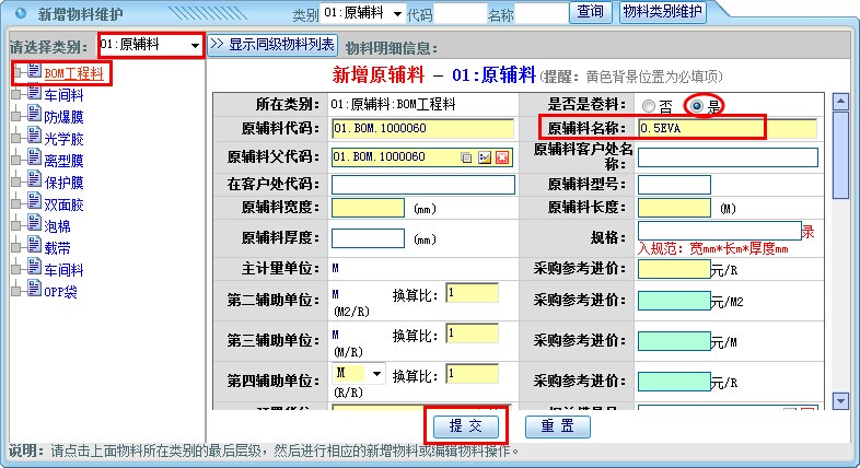 操作步骤:系统管理——物料管理——新增物料;进入页面如下图操作: 点晴模切ERP更多信息:https://moqie.clicksun.cn,联系电话:4001861886 该文章在 2014/9/17 15:19:25 编辑过 |