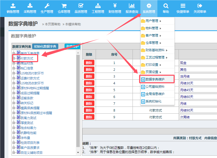 ![]() ![]() 1、以管理员身份进入ERP系统--》系统管理--》数据字典维护,选择“付款方式”进行添加和维护。 2、如下图所示: