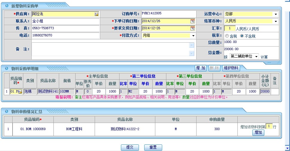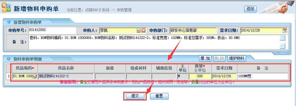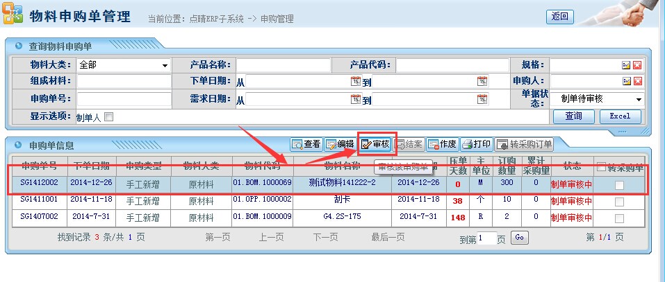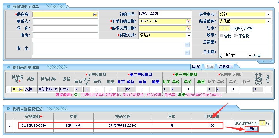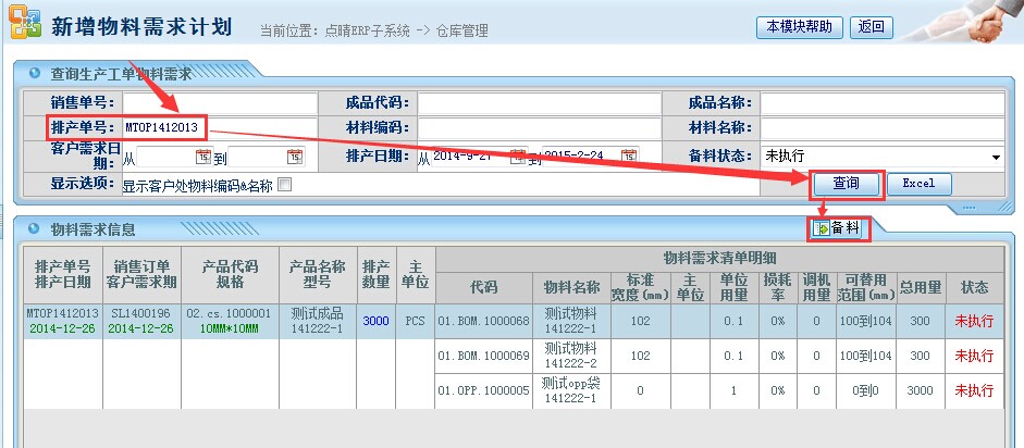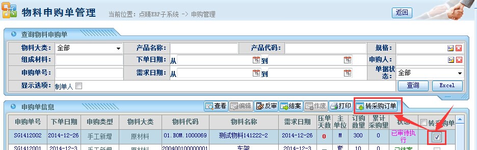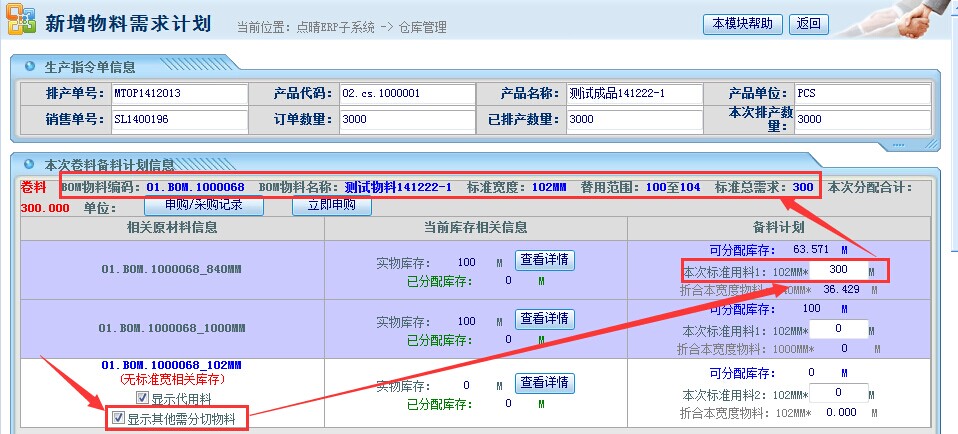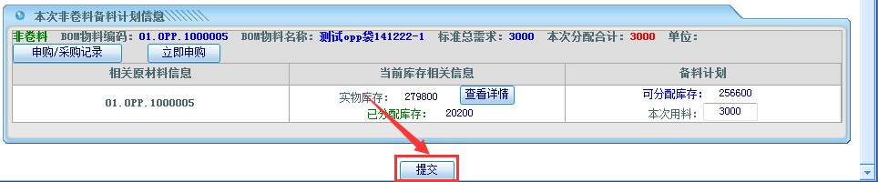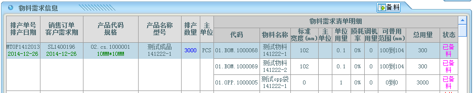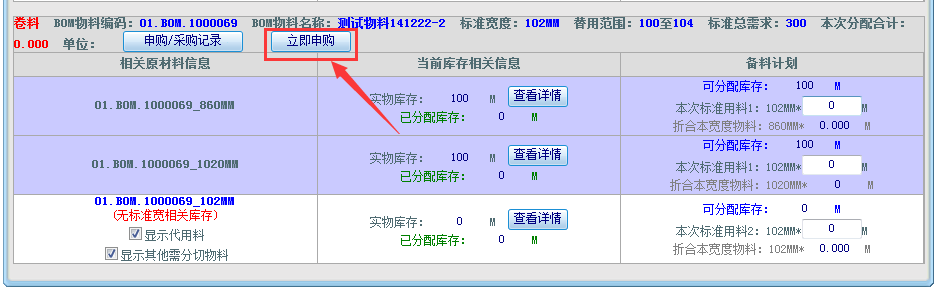 操作步骤:生产管理——排产管理——新增物料需求计划;进入页面如下图操作: 进入页面,按照排产单号进行查询,选中需要做备料计划的单据,点击“备料”按钮,进入如下图所示页面: 进入此页面,能看到详细的物料需求以及该物料其他的规格库存情况。根据标准需求填写数值(上图显示标准用料102MM需求300M,最后折合现有库存840MM宽,63.571M,库存现有数值为100M,满足生产需求)。 按照此分析方式,填写其他相应物料,点击提交即可;如下图所示: 提交后显示备料的信息,如下图所示: 备料完成。 若在分配图中,发现物料不足单据生产需求,则需要备料;如下图所示: 点击“立即申购”,转到申购单页面;如下图所示: 该页面自动带出所需标准物料的用量,按照需求填写申购物料类别(BOM工程料),点击“提交”即可。之后转到申购单审核页面;如下图所示: 选择申购单,点击“审核”即可。审核完成后,如下图所示: 进入此页面,直接点击“转采购订单” 点击后进入采购单下单页面,如下图所示: 点击“增加”,出现对应物料的所有规格的物料信息;可供下采购单人员任意选择。 添加到采购明细即可;如下图所示: 填写采购信息即可提交,则生产对应的采购单。 点晴模切ERP更多信息:https://moqie.clicksun.cn,联系电话:4001861886 该文章在 2014/12/26 14:54:02 编辑过 |