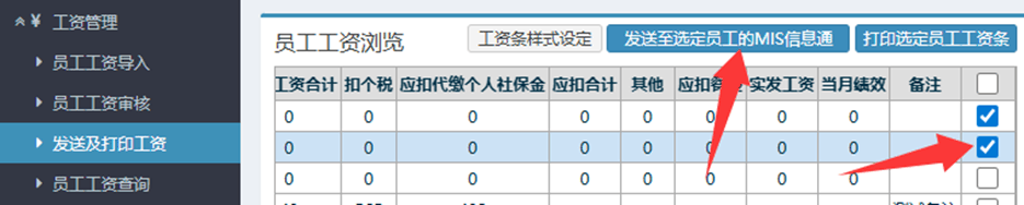 审核通过后即可查询,默认显示工资条样式,如需显示明细表格可取消勾选工资条,如需查看全部员工可勾选显示全部: