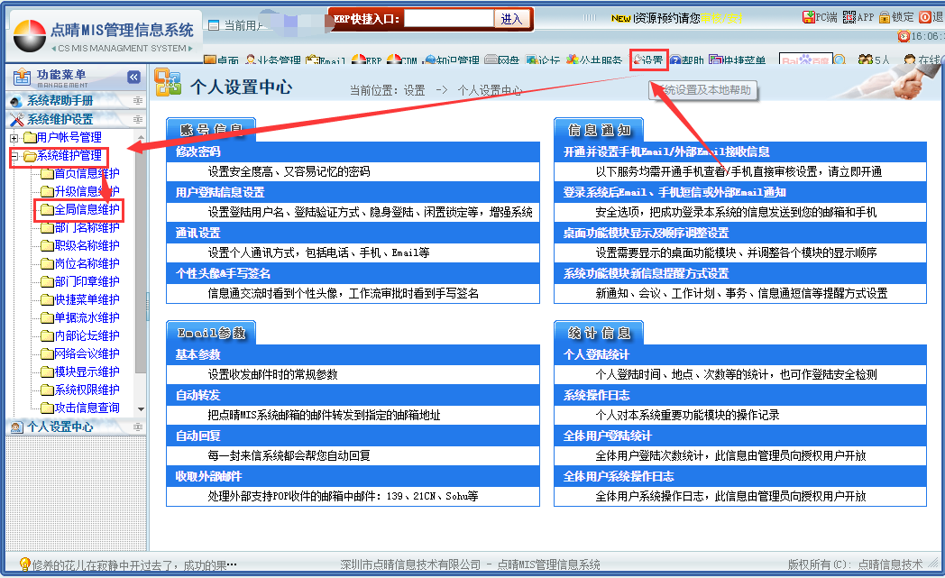 步骤一:依次点击设置——系统管理——全局信息维护;如下图所示: