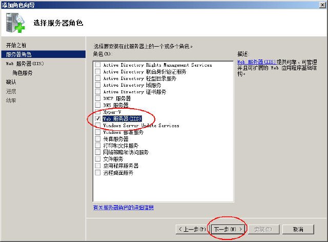 2、添加服务器角色,选中“Web服务器(IIS)”,点击下一步: