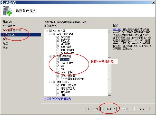 3、点击左侧“角色服务”,选择列表中的对应选项,比如要支持ASP,就要选择ASP功能: