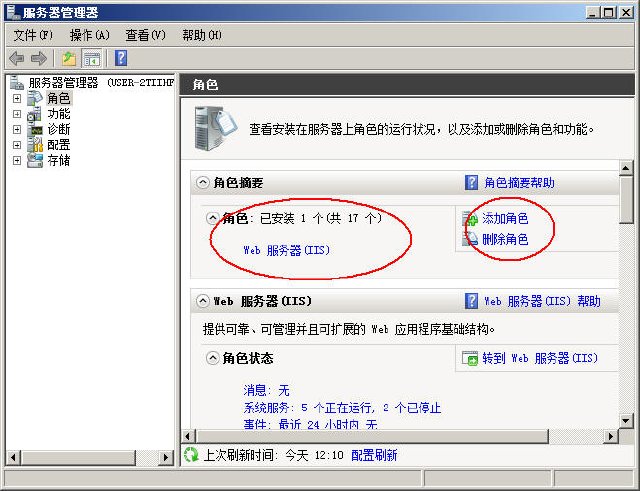 IIS在Win2008中,是以组建的方式加载的,因此不需要安装组建,只需要开启组建功能就可以,操作如下: 1、在空的服务器中,点击服务器管理器(或者鼠标右键我的电脑,打开“管理”),添加角色: