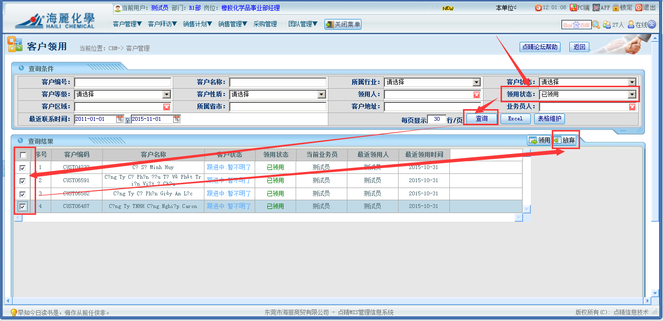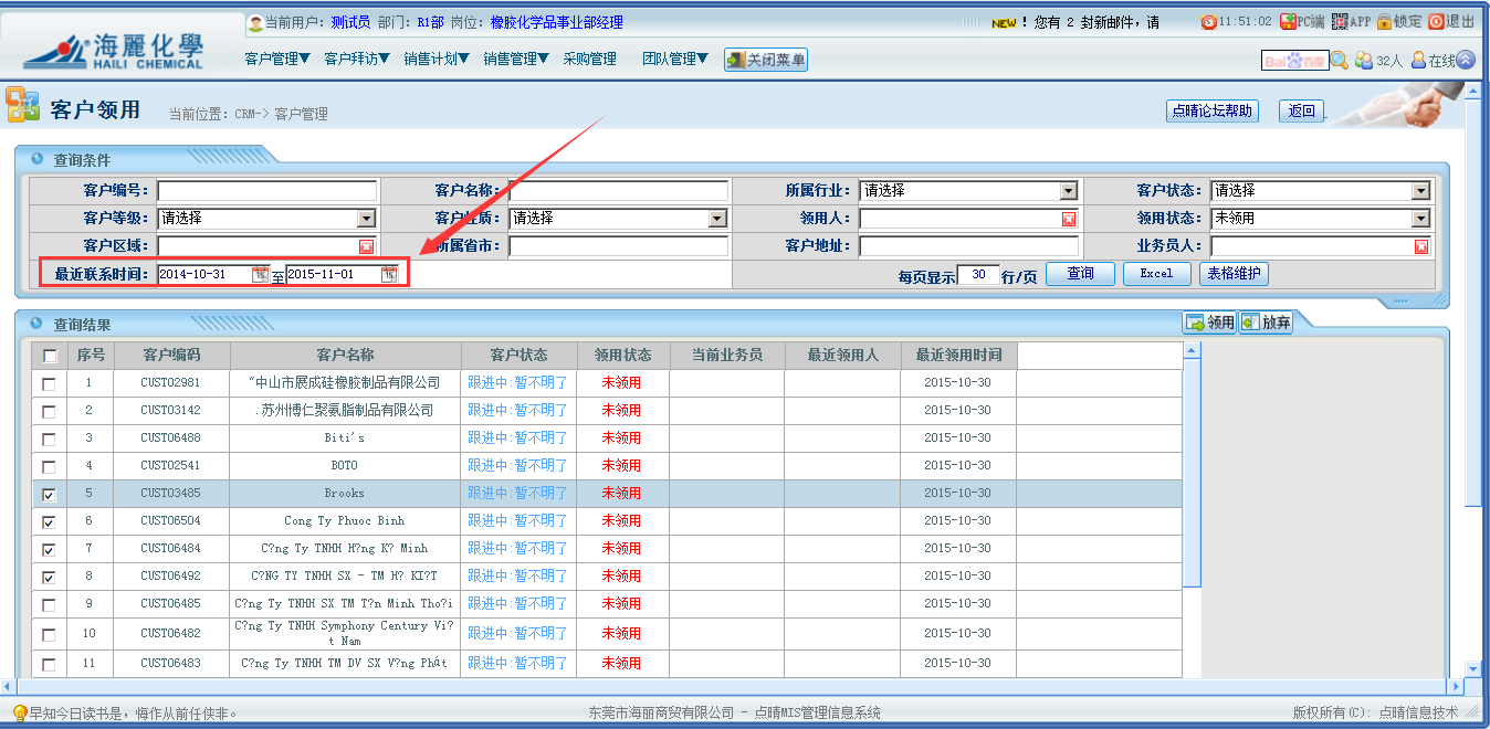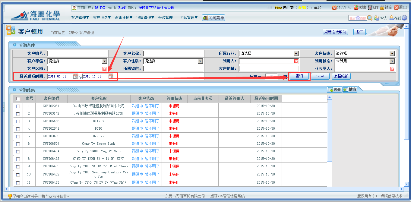 在领用客户页面找不到现有的客户原因分析: 1、查询页面时间范围限制了;默认查询时间为一年的范围,如下图: 此时,可将时间筛选范围扩大;如下图所示: 2、其他业务员做了误领用操作了 此时需要对应业务员放弃领用操作;如下图所示: 3、客户还没有录入系统 此时需要录入客户进去即可:录入客户信息操作链接:链接地址