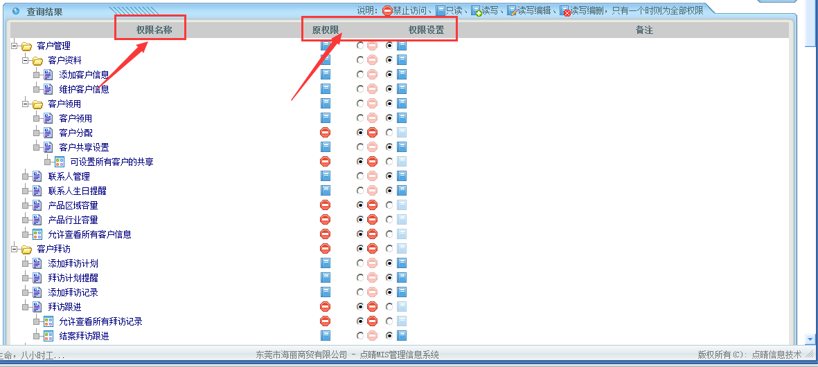 注:权限名称一般对应着功能菜单明细;红色代表未开启权限,蓝色代表开启权限