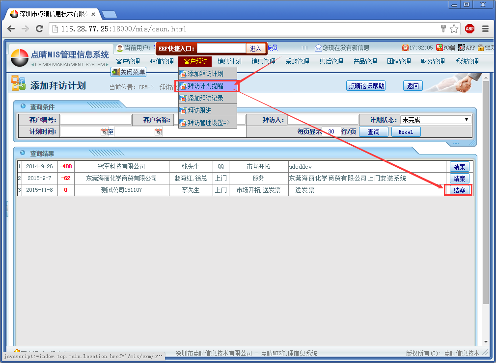 操作步骤:客户拜访——拜访计划提醒——结案;如下图: