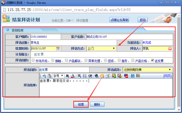 录入实际拜访记录——点击“结案”即可;如下图所示: