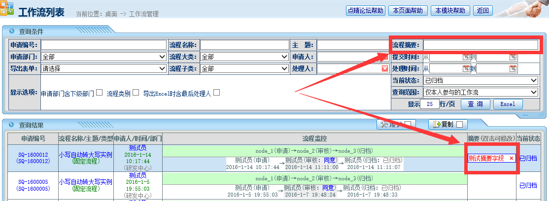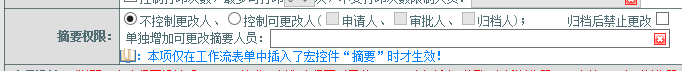 :设计工作流流程时,摘要项目提示:本项仅在工作流表单中插入了宏控件“摘要”时才生效,如何使用啊?![]() 为了方便用户在工作流流程申请、审核时、归档后都能标记一些特殊的内容,以方便查找或后续使用,点晴OA在工作流模板中引入了一个特殊的宏控件字段字段:摘要,该字段允许进行复杂的权限控制: ![]() 为了激活这个功能,网管在设计工作流模板时,必须先在模板中放入一个摘要字段,才可以在后续审核、归档等环节对这个特殊字段进行编辑更改等复杂权限的控制和维护。注意,一个模板只允许插入一个摘要字段,不支持多个摘要字段宏控件: ![]() 维护后的摘要信息可以作为查询条件查找,有权限的用户也可以直接双击摘要进行更改: ![]() 该文章在 2020/4/6 20:18:13 编辑过