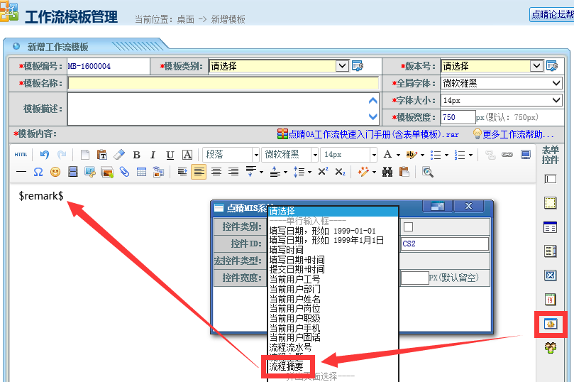 流程设计页面提示:本项仅在工作流表单中插入了宏控件“摘要”时才生效,如何使用啊?
