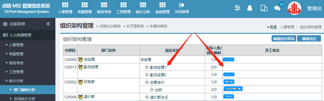 上面位置清楚的显示了副总经理1这个岗位没有具体的人员,给这个岗位增加具体人员绑定即可。