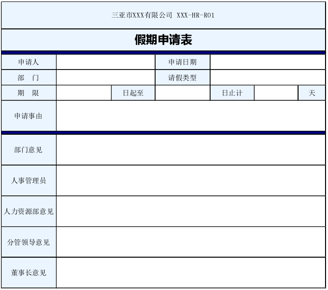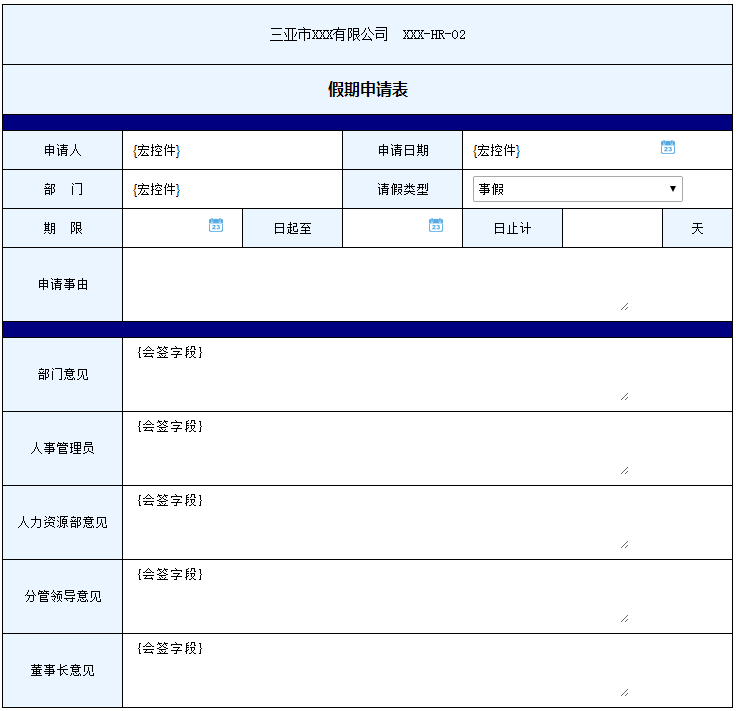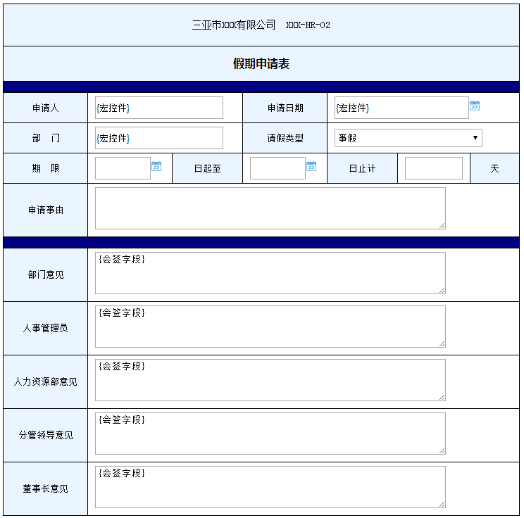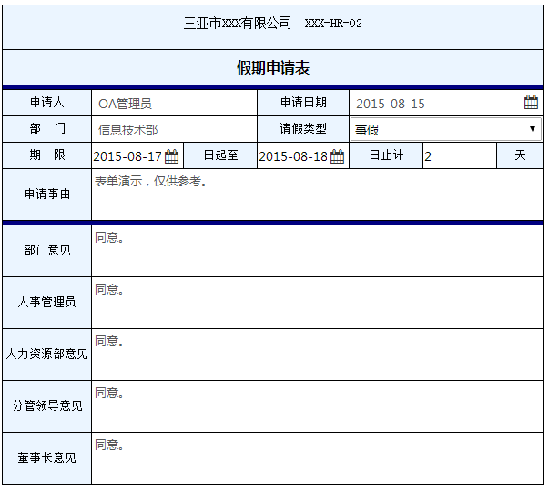 前言 一、怎样做好的表单 二、需求一致性设计 1、客户需求的一致性 2、表单表头、编号和Logo的设计 3、对客户需求的提炼和专业性角度优化 4、表单打印设置对表单设计的要求 三、表单美观性设计 1、表单风格的统一设计 2、表单字体、颜色、边框的设计 3、表格尺寸的统一规范 四、技术性设计实现 1、技术角度对表单内容和位置的调整 2、控件的选择和关联 3、保证表单控件大小和表格的对齐 总结 前言 用过OA系统的人都知道,企业OA的管理,绝大多数都是通过流程来进行规范和实现的,所以流程是OA系统中最常用也是最为核心的内容。而表单设计又是表单流程设计的第一步(流程是第二步),也是最重要和最耗费时间的环节。 对于外行人员,可能觉得表单设计不就是一个表格吗,有什么难度?用Excel轻轻松松就可以画出一个表格来了。也有OA厂家的人为了宣传自己的产品牛叉,向客户宣传他的流程表单设计多么简单,图形可视化操作很快就做出来了(其实他心里明白,表单流程设计是OA设计里最花时间的,所以一再强调自己产品在这方面设计起来很简单)。事实上,我们做过OA系统的人都知道,表单设计需要考虑很多方面,想做一个好表单,绝对没有这么简单。下面,就我们的经验,给大家分享一下,希望对您有所帮助。 一、怎样做好的表单 一个好的表单设计,需要考虑客户原始需求的一致性、设计美观性,以及技术性的实现多个方面,后面我们会详细介绍。这里想强调一个观点,永远不要指望表单设计器能够设计出优选的表单。 OA系统自带的表单设计器可以帮助我们进行初步的表单设计,比如设计表格,添加表单的控件,进行控件参数的基本设置,如控件名称,控件的属性和控件间的关联(如时间日期控件与文本控件的关联)等等。但是不要指望表单设计器能够设计出完美的表单,就我们了解的情况,目前的业内的表单设计器都存在一些功能上的不足,比如设计器设计的表格和控件的大小和最后预览、运行的大小不同,无法做到设计和运行的一致性。而且设计器能够调整的参数有限,很多时候还要在表单的HTML代码中修改来达到设计的最终效果。还有一个更为重要的原因,就是没有哪一个OA厂家和表单设计器会给你提供表单设计经验,这个需要通过经验积累并形成表单设计规范,从而指导后来者进行表单设计。所以,设计器的局限性导致了我们很难用他设计出优秀的表单。 那么,该通过什么样的工具和方法设计出一个好的表单?就我的个人经验,需要表单设计器、Excel表格、表单HTML代码(在表单设计器中能够看到),以及表单设计经验规范四个方面结合起来。 下面,我们结合表单设计的几个方面分别介绍该怎样运用工具、代码和规范进行设计。 二、需求一致性设计 1、客户需求的一致性 一切的开始,都是从客户的需求出发的。在需求交流阶段,客户会提出自己的想法,调研各个部门的现有的和有计划还没做的流程表单需求,同时会提供现有的纸件表单给我们,让我们按照其进行设计。请记住,这只是客户的原始需求,他们不懂实现技术,更为专业性的需求和调整还是需要我们后面帮助其挖掘和实现。最后我们收集、整理后再跟客户进行确认。具体的需求交流技巧不是本文想要表述的重点,这里仅以一个具体的表单开始,向大家介绍表单的设计过程。例如,客户让我们做一个客户请假单,原始表单如下图: ![]() 2、表单表头、编号和Logo的设计 有些客户的原始纸件表单已经包含了表头、编号,甚至有公司的logo,但有的客户并没有这些。我们从信息完整性和规范性的角度,建议客户增加相关的内容。这里,我们增加表头如下: ![]() 3、对客户需求的提炼和专业性角度优化 为了方便客户使用,清晰的划分提示性文字(标题)和需要申请人员填写的内容,从专业性的角度,我们对表单修改如下: ![]() 这里,我们把休假的时间范围的内容进行了调整。这样可以更为清晰的区分提示性文字和填写内容区域。而且,为后续在表格中添加文本和日期控件提供了独立的空间区域。 4、表单打印设置对表单设计的要求 客户提供给我们的纸件表单一般都是A4纸大小范围内能够完整呈现的。但是有的新的表单需求,客户没有现成的纸件,而且表单内容比较多,设计人员往往做出来的表格比较大,实际高度或宽度超出了A4纸的打印范围。客户在使用过程中会发现这个问题,出现一页打不完,或者同一行的表单被分成了多页,打印的效果很难看,不可接受。针对于此,我们给出以下设计原则和设计方法: 1)表单的宽度设计不能超出A4纸的宽度减去左右两边的留白尺寸。 我们的经验值是表单宽度不超过540px。如果宽度超出了,必须把一行内的内容放到下一行进行设计,没有人愿意把表格的一行分开打印。 2)表单的高度设计不能超出A4纸的高度减去上下两边的留白尺寸。 我们的经验值是表单高度不超过700px。如果表格的高度超出了不多(20%以内),建议通过调整行高尽量缩减到700px大小之内。如果高度超出了不止20%,通过行高调整到一页内比较困难,则可以保留现有的高度设计,不进行调整,最终打印2页罢了。如果多页情况,也可以参考20%原则进行调整,尽量让客户少打印页数,节省时间和纸墨。 3)如何测量表格的尺寸 控件的尺寸可以通过设计器的控件参数查看来获知,表格和表单的尺寸主用通过表单的HTML代码进行查看。 三、表