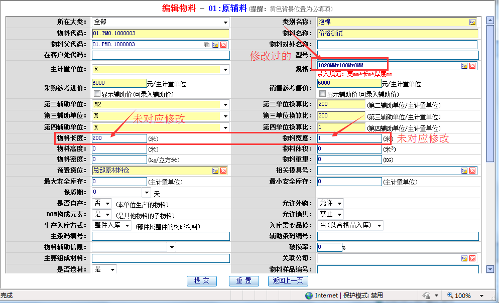 此现象出现是因为基础资料的规格被修改了,并且只修改了材料规格,未修改对应材料的宽度和长度;如下图所示:
