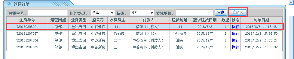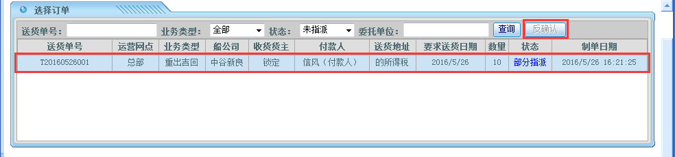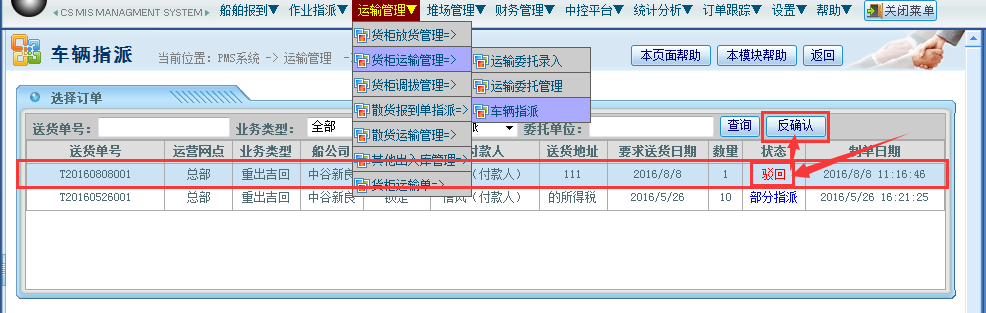 驳回完成后;回到车辆指派界面进行反确认操作;操作步骤:运输管理——货柜运输管理——车辆指派——选择对应的运输单——点击“反确认”按钮;如下图所示: