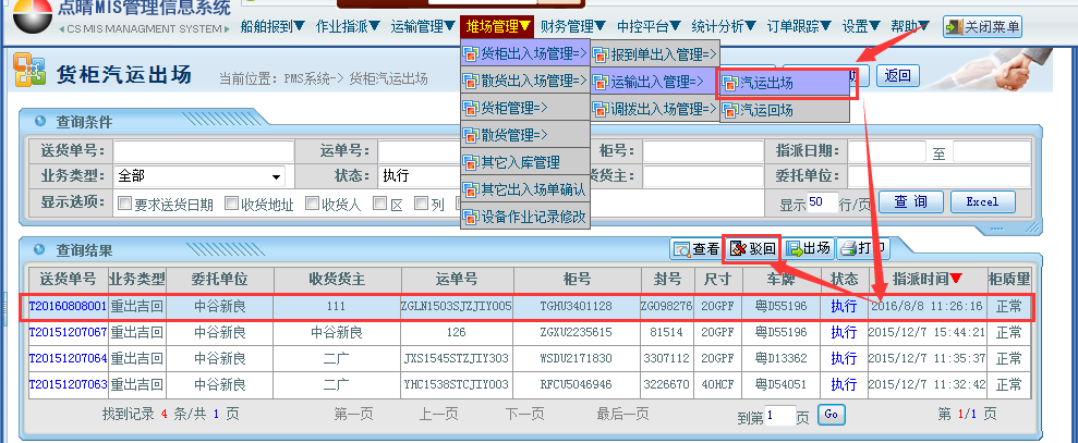 操作步骤:堆场管理——货柜出入场管理——运输出入管理——汽运出场;选择对应的运输明细——点击“驳回”按钮;如下图所示: