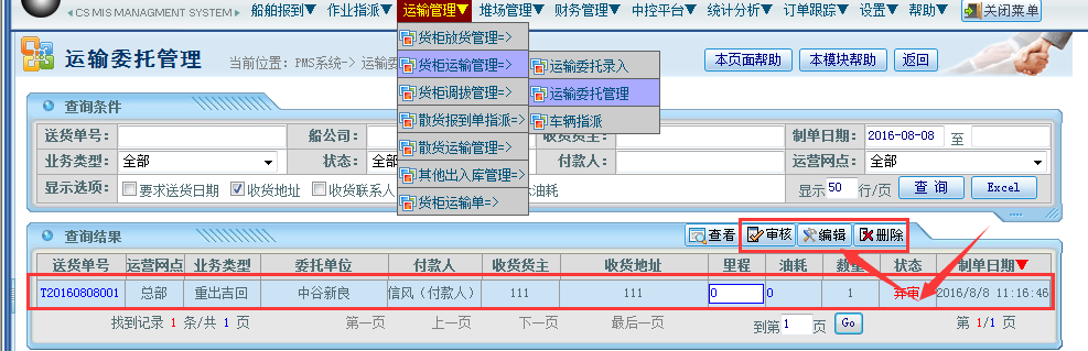 操作步骤:运输管理——货柜运输管理——运输委托管理——选择对应的“制单”状态单据——点击编辑按钮;如下图所示:
