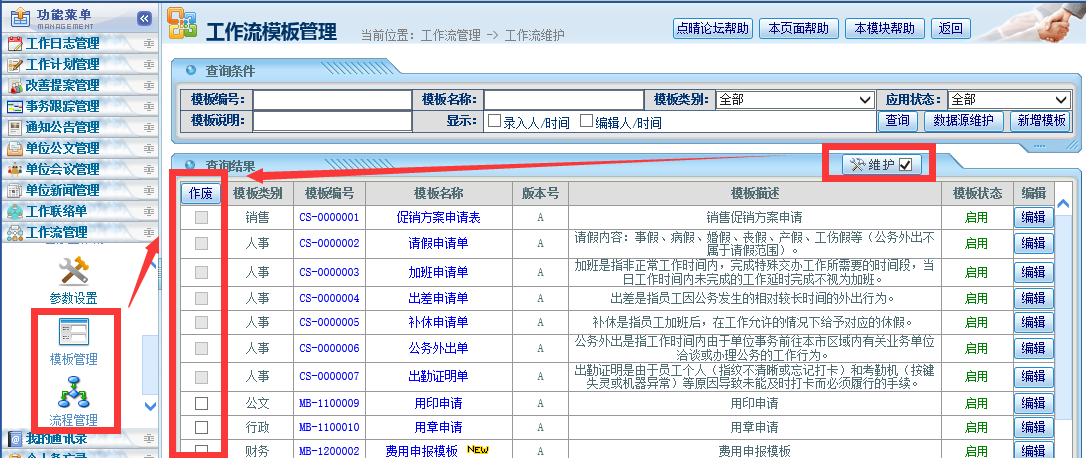 点晴OA系统工作流模块管理员设计时如何作废或隐藏不再使用的表单模板或流程?