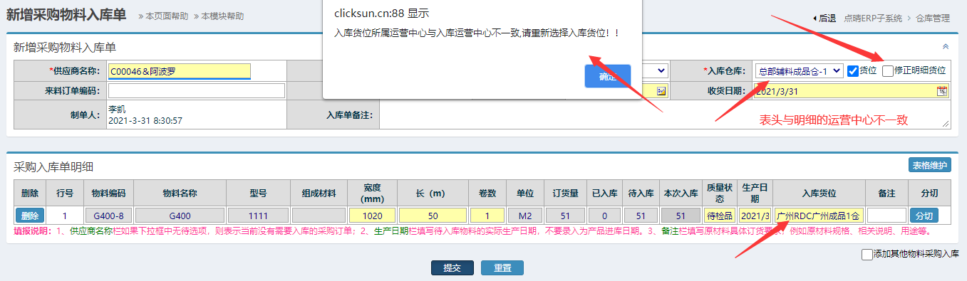 解决方法:勾上修正明细货位,再次选择入库仓库,物料明细入库货位就会保持一致,提交保存,就可以入库了。