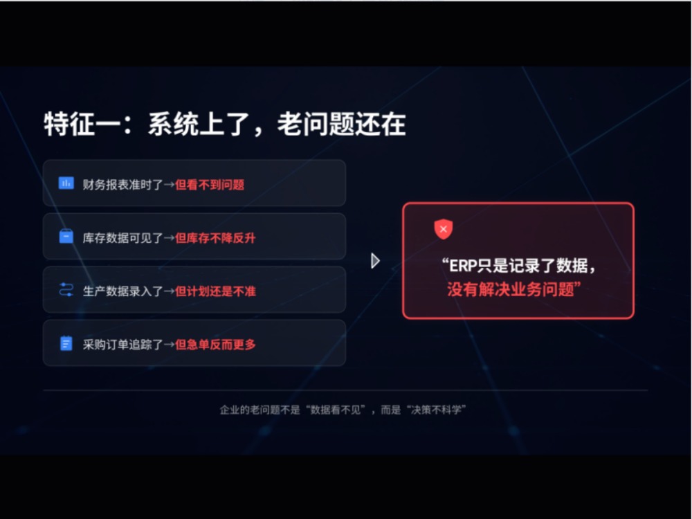 特征一:系统上了,但老问题还在财务报表能出了,但老板还是看不到关键问题;库存可以实时查了,但库存不降反升;生产数据录进去了,但计划还是不准。ERP只是记录了数据,没有解决业务问题。