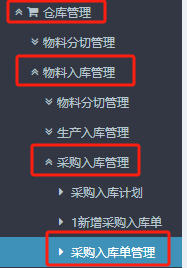 1.进入ERP系统后,在上方或者左侧点击“仓库管理”》“物料入库管理“》“采购入库管理”》”采购入库单管理“。