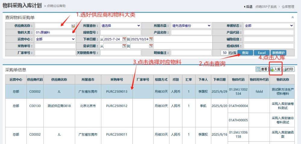 2.进入页面后,按图操作:选好供应商和物料大类,点击查询。然后点击选择对应物料,点击入库。