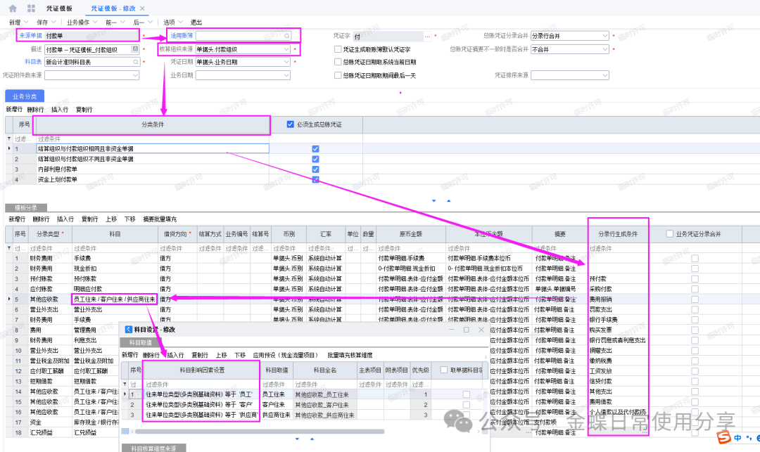 【概述】业务模块的单据,根据凭证模板生成到总账凭证。凭证模板用于设置凭证各要素的取值规则,如凭证日期、凭证字、摘要、科目、借贷方向及金额等。根据凭证模板配置,建立业务和财务的数据关联,实现业务财务一体化,保证账务处理的质量和效率。【详细说明】凭证模板的总体编制逻辑:单据来源——适用账簿——核算组织来源——分类条件——分...