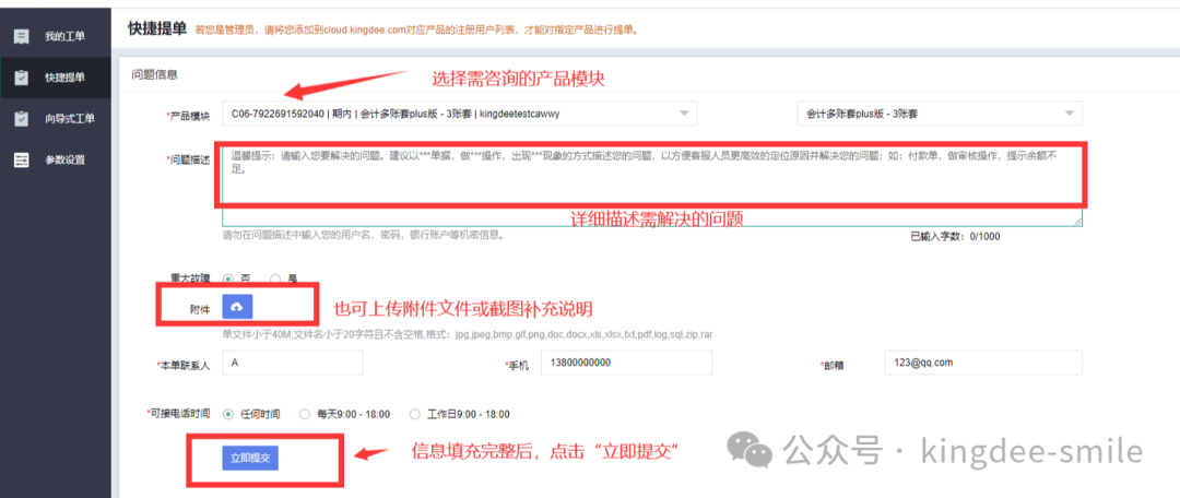 一、【解释说明】“提交工单”系统可记录您的问题,后续由工程师回电处理,可点击链接:https://ticket.kingdee.com/直接进入提单系统,进行工单提交和查询工单处理进度;也可通过小K咨询界面右侧,点击“提交工单”进入工单系统。二、【提单操作】1、点击链接:https://ticket.kingdee.c...