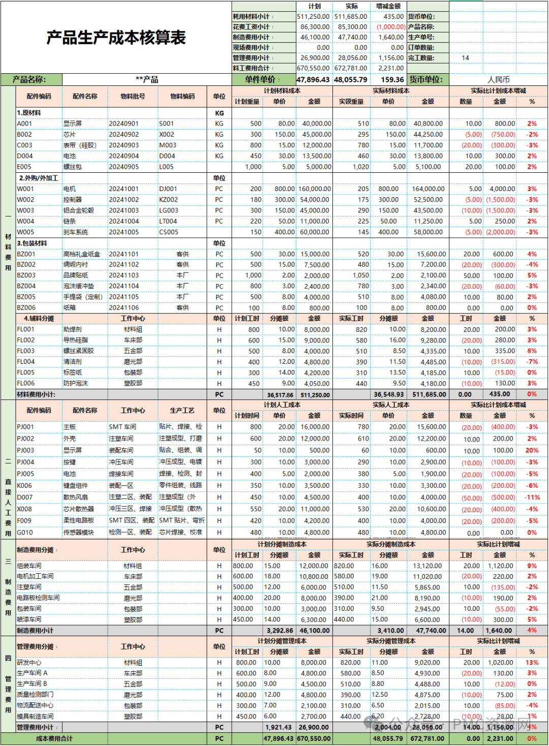 今天为大家分享的产品生产成本核算表,在wps,excel下均可使用,它的作用可以帮助精准把控成本结构、辅助科学定价决策、助力成本控制与优化、也是评估部门绩效的有力依据。该表格包括材料费用、直接人工费用、制造费用、管理费用四个大的部分。一、材料费用这部分详细记录了生产产品所需的各类材料成本。包括原材料(如钢材、木材等)...