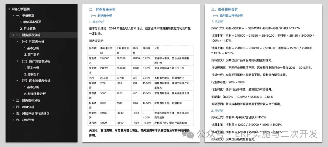 📝AI财务分析报告本期更新:支持基于财务报表数据,生成分析报告,辅助决策。有权限的用户,可对报表和指标进行变动原因分析与行业对比分析,对趋势和风险进行洞察与评估,针对主要发现获取重点行动建议。其中:报表分析:是指对利润表等报表进行整体分析、报表项变动分析、分部对比分析/资产结构分析/利润质量分析、提示关注点等。指标分...