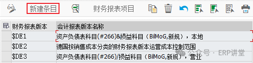1.创建财务报表版本IMG-财务会计-主数据-总账科目-财务报表结构-定义会计报表版本1.1新建报表版本:点击“新建条目”创建财务报表版本;自动项目代码:在编辑报表版本的时候,每一行的行项目号是否可以手工输入,如果选择该项,则不能手工输入;图表/科目:每一个财务报表版本必须指定对应的会计科目表;功能范围程序:如果启用功...