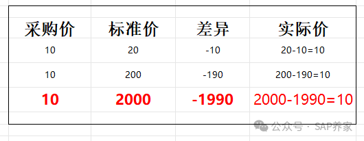 看到了没,无论标准价格和实际价相差多大,负差异无论多大,都不会形成负单价,并且实际价都等于采购价。