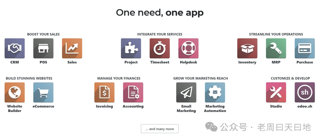 Odoo:以前叫OpenERP,是用Python编写,使用PostgreSQL作为后端数据库的企业应用软件套件。Odoo功能丰富,包含销售、采购、库存、会计、人力资源、生产制造、项目管理等模块。其社区版是免费开源的,企业版则提供额外应用程序、基础设施及专业服务。Odoo拥有全球最大的商业应用程序商店,基于开源开发模式,...