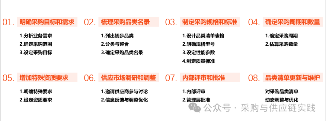 制定集中采购的品类清单是一个系统性过程,需要综合考虑业务需求、采购预算、供应商能力等多方面因素。通常来说,设计集中采购品类清单可以采取以下步骤进行。一、明确采购目标和需求。1、分析业务需求。深入了解企业各部门的业务需求,包括生产、运营、销售等环节,明确所需物资,工程和服务的种类和数量。2、确定采购范围。根据企业的业务需...