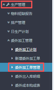 点晴ERP-委外加工单管理流程 进入ERP系统之后,在左侧的功能菜单里找到“生产管理”,点开“委外加工管理”,点击“委外加工单管理”。 2.进入页面后,按图操作:选好委外单类型、物料类型以及单据状态,然后点击查询。在下方得到当前确认的加工单信息。 ​