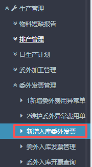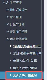 点晴ERP-委外入库开票查询-操作流程 进入ERP系统之后,在左侧的功能菜单里找到“生产管理”,点开“委外发票管理”,点击“委外入库开票查询”。 2.进入界面后,先点击查询,再点击选中对应的物料信息,确认状态为“未开票”,然后就点击右边的新增委外发票 下一步流程跳转链接:点晴ERP-委外入库发票-操作流程...