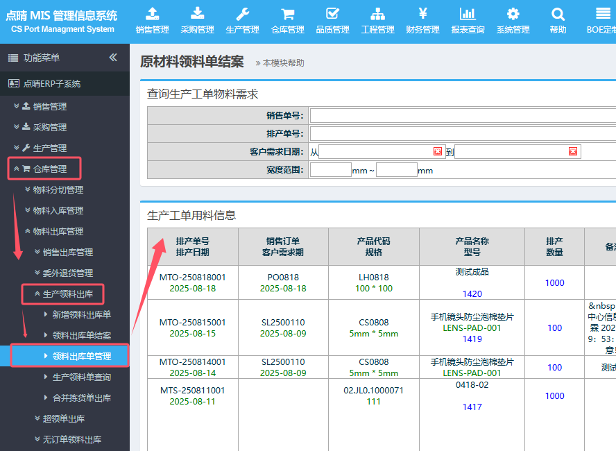 【点晴模切ERP】如何查询生产工单已出库的领料单明细信息?进入:仓库管理-》生产领料出库-》领料出库单管理就可以查到所有生产工单的领料单明细信息了。