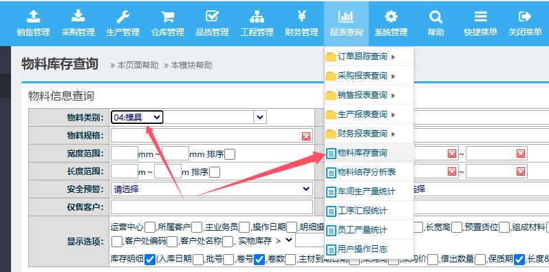 在哪里可以查看到模具有多少库存数量?在报表查询-》物料库存查询中,物料类别选择:模具,如下图: