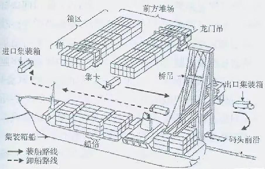 01.码头布局集装箱码头最基础的两个功能就是将出口重箱输送出去,将进口空箱运进来。以下是简化版的装船路线和卸船路线。基本布局如下,不同数字代表不同的功能区:1.码头前沿:设有岸边集装箱起重机及其运行轨道。2...