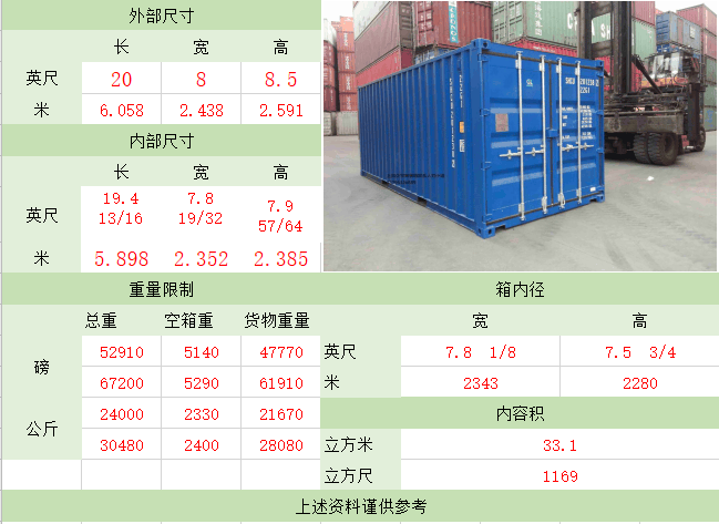 通俗叫法:长20尺俗称小柜;高8尺6寸俗称平柜;高9尺6寸俗称高柜
